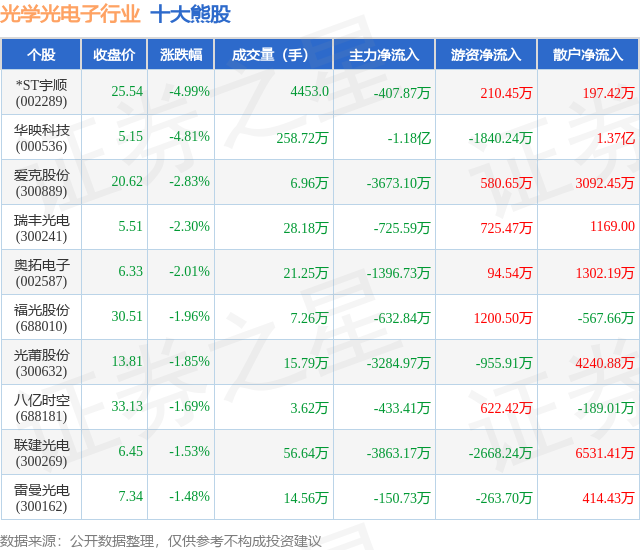 个股表现方面,光学光电子行业当日领跌股为*ST宇顺(002289),该股当日报收25.54,下跌4.99%,成交量4453.0,主力资金净流出407.87万元。华映科技(000536)以下跌4.81%紧随其后,该股当日成交量258.72万,主力资金净流出1.18亿元。除此之外,爱克股份(300889)、瑞丰光电(300241)、奥拓电子(002587)均进入当日熊股之列。具体个股列表见下表: