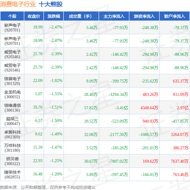 个股表现方面,消费电子行业当日领跌股为豪声电子(920701),该股当日报收18.99,下跌2.47%,成交量3.46万,主力资金净流出77.93万元。豪声电子(920701)以下跌2.47%紧随其后,该股当日成交量3.46万,主力资金净流出77.93万元。除此之外,威贸电子(920346)、威贸电子(920346)、信音电子(301329)均进入当日熊股之列。具体个股列表见下表:
