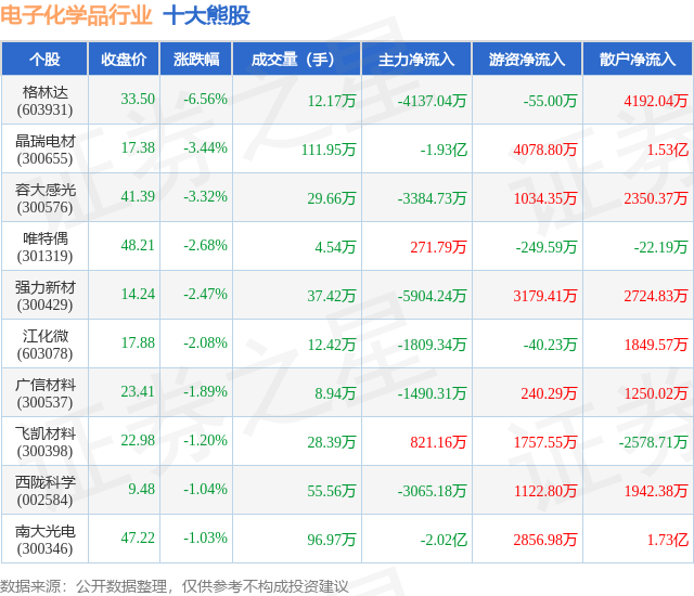 个股表现方面,电子化学品行业当日领跌股为格林达(603931),该股当日报收33.5,下跌6.56%,成交量12.17万,主力资金净流出4137.04万元。晶瑞电材(300655)以下跌3.44%紧随其后,该股当日成交量111.95万,主力资金净流出1.93亿元。除此之外,容大感光(300576)、唯特偶(301319)、强力新材(300429)均进入当日熊股之列。具体个股列表见下表: