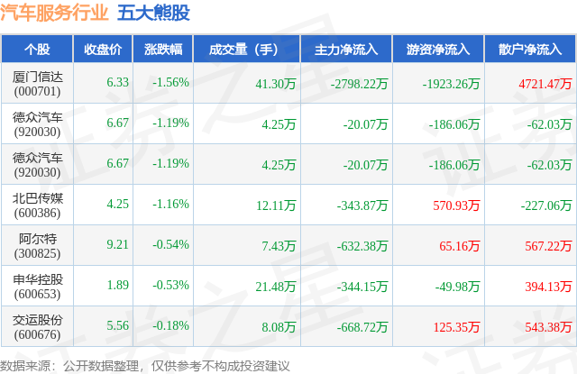 个股表现方面,汽车服务行业当日领跌股为厦门信达(000701),该股当日报收6.33,下跌1.56%,成交量41.3万,主力资金净流出2798.22万元。德众汽车(920030)以下跌1.19%紧随其后,该股当日成交量4.25万,主力资金净流出20.07万元。除此之外,德众汽车(920030)、北巴传媒(600386)、阿尔特(300825)均进入当日熊股之列。具体个股列表见下表: