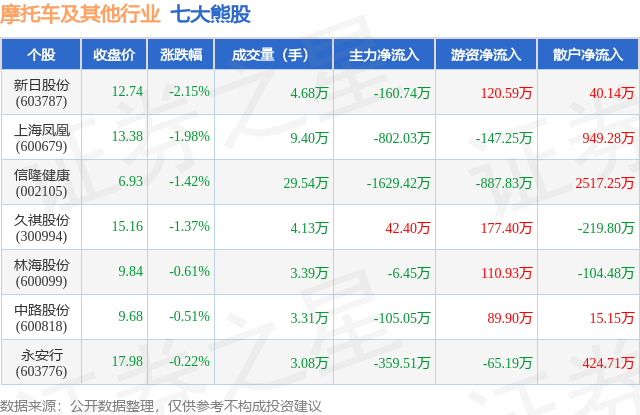 个股表现方面,摩托车及其他行业当日领跌股为新日股份(603787),该股当日报收12.74,下跌2.15%,成交量4.68万,主力资金净流出160.74万元。上海凤凰(600679)以下跌1.98%紧随其后,该股当日成交量9.4万,主力资金净流出802.03万元。除此之外,信隆健康(002105)、久祺股份(300994)、林海股份(600099)均进入当日熊股之列。具体个股列表见下表: