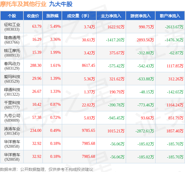 个股表现方面,摩托车及其他行业当日领涨股为征和工业(003033),该股当日报收63.79,上涨5.49%,成交量3.74万,主力资金净流入1622.92万元。隆鑫通用(603766)以上涨3.36%紧随其后,该股当日成交量30.61万,主力资金净流出1417.2万元。除此之外,钱江摩托(000913)、春风动力(603129)、爱玛科技(603529)均进入当日牛股之列。具体个股列表见下表: