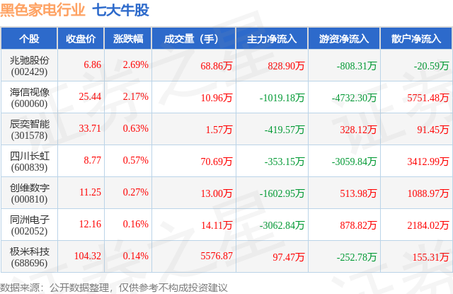 个股表现方面,黑色家电行业当日领涨股为兆驰股份(002429),该股当日报收6.86,上涨2.69%,成交量68.86万,主力资金净流入828.9万元。海信视像(600060)以上涨2.17%紧随其后,该股当日成交量10.96万,主力资金净流出1019.18万元。除此之外,辰奕智能(301578)、四川长虹(600839)、创维数字(000810)均进入当日牛股之列。具体个股列表见下表: