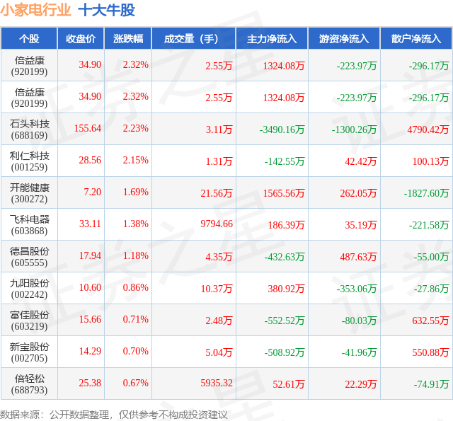 个股表现方面,小家电行业当日领涨股为倍益康(920199),该股当日报收34.9,上涨2.32%,成交量2.55万,主力资金净流入1324.08万元。倍益康(920199)以上涨2.32%紧随其后,该股当日成交量2.55万,主力资金净流入1324.08万元。除此之外,石头科技(688169)、利仁科技(001259)、开能健康(300272)均进入当日牛股之列。具体个股列表见下表: