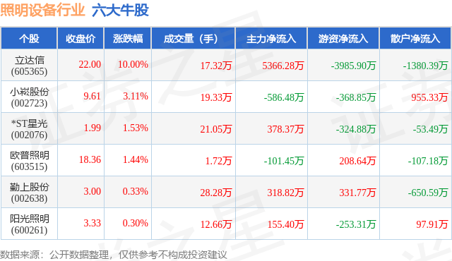 个股表现方面,照明设备行业当日领涨股为立达信(605365),该股当日报收22.0,上涨10.0%,成交量17.32万,主力资金净流入5366.28万元。小崧股份(002723)以上涨3.11%紧随其后,该股当日成交量19.33万,主力资金净流出586.48万元。除此之外,*ST星光(002076)、欧普照明(603515)、勤上股份(002638)均进入当日牛股之列。具体个股列表见下表: