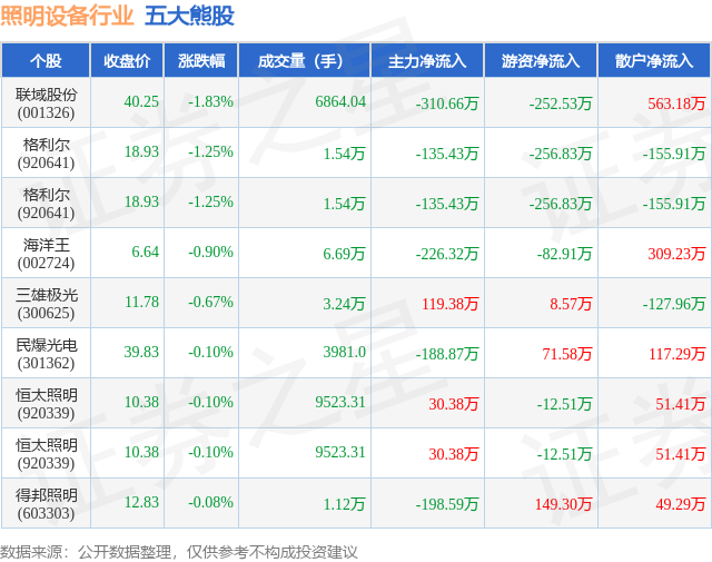 个股表现方面,照明设备行业当日领跌股为联域股份(001326),该股当日报收40.25,下跌1.83%,成交量6864.0,主力资金净流出310.66万元。格利尔(920641)以下跌1.25%紧随其后,该股当日成交量1.54万,主力资金净流出135.43万元。除此之外,格利尔(920641)、海洋王(002724)、三雄极光(300625)均进入当日熊股之列。具体个股列表见下表:
