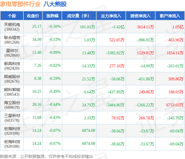 个股表现方面,家电零部件行业当日领跌股为天银机电(300342),该股当日报收25.17,下跌6.5%,成交量101.01万,主力资金净流出1.42亿元。联合精密(001268)以下跌6.12%紧随其后,该股当日成交量5.03万,主力资金净流入522.05万元。除此之外,星帅尔(002860)、毅昌科技(002420)、顺威股份(002676)均进入当日熊股之列。具体个股列表见下表: