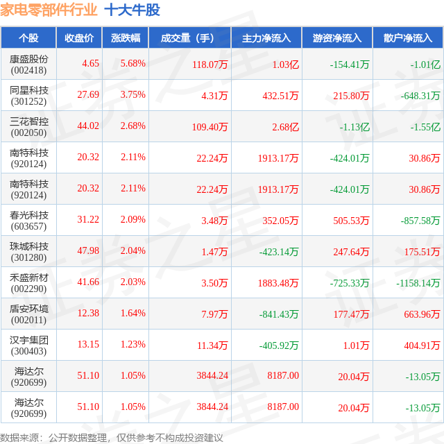 个股表现方面,家电零部件行业当日领涨股为康盛股份(002418),该股当日报收4.65,上涨5.68%,成交量118.07万,主力资金净流入1.03亿元。同星科技(301252)以上涨3.75%紧随其后,该股当日成交量4.31万,主力资金净流入432.51万元。除此之外,三花智控(002050)、南特科技(920124)、南特科技(920124)均进入当日牛股之列。具体个股列表见下表: