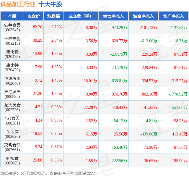 个股表现方面,食品加工行业当日领涨股为安井食品(603345),该股当日报收82.2,上涨2.76%,成交量8.3万,主力资金净流出973.29万元。千味央厨(001215)以上涨2.64%紧随其后,该股当日成交量3.56万,主力资金净流入620.77万元。除此之外,康比特(920429)、康比特(920429)、华统股份(002840)均进入当日牛股之列。具体个股列表见下表: