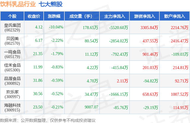 个股表现方面,饮料乳品行业当日领跌股为皇氏集团(002329),该股当日报收4.12,下跌10.04%,成交量178.65万,主力资金净流出5520.6万元。贝因美(002570)以下跌2.22%紧随其后,该股当日成交量80.54万,主力资金净流出2854.02万元。除此之外,一鸣食品(605179)、佳禾食品(605300)、品渥食品(300892)均进入当日熊股之列。具体个股列表见下表: