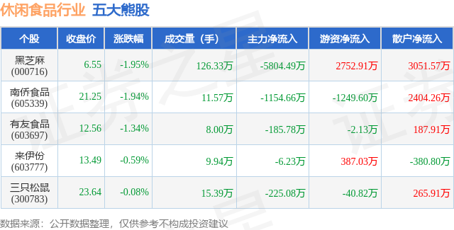 个股表现方面,休闲食品行业当日领跌股为黑芝麻(000716),该股当日报收6.55,下跌1.95%,成交量126.33万,主力资金净流出5804.49万元。南侨食品(605339)以下跌1.94%紧随其后,该股当日成交量11.57万,主力资金净流出1154.66万元。除此之外,有友食品(603697)、来伊份(603777)、三只松鼠(300783)均进入当日熊股之列。具体个股列表见下表: