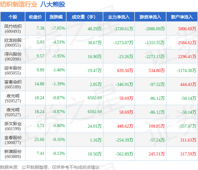 个股表现方面,纺织制造行业当日领跌股为凤竹纺织(600493),该股当日报收7.38,下跌7.05%,成交量48.29万,主力资金净流出3720.61万元。欣龙控股(000955)以下跌4.51%紧随其后,该股当日成交量38.67万,主力资金净流出1273.07万元。除此之外,浔兴股份(002098)、迎丰股份(605055)、富春染织(605189)均进入当日熊股之列。具体个股列表见下表: