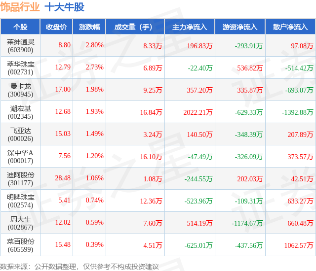 个股表现方面,饰品行业当日领涨股为莱绅通灵(603900),该股当日报收8.8,上涨2.8%,成交量8.33万,主力资金净流入196.83万元。萃华珠宝(002731)以上涨2.73%紧随其后,该股当日成交量6.89万,主力资金净流出22.4万元。除此之外,曼卡龙(300945)、潮宏基(002345)、飞亚达(000026)均进入当日牛股之列。具体个股列表见下表: