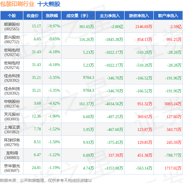 个股表现方面,包装印刷行业当日领跌股为顺灏股份(002565),该股当日报收15.17,下跌9.97%,成交量301.65万,主力资金净流出2.8亿元。昇兴股份(002752)以下跌9.65%紧随其后,该股当日成交量116.26万,主力资金净流出1845.38万元。除此之外,宏裕包材(920274)、宏裕包材(920274)、佳合科技(920392)均进入当日熊股之列。具体个股列表见下表: