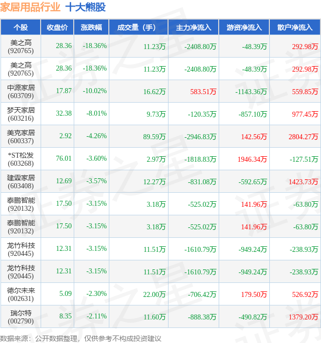 个股表现方面,家居用品行业当日领跌股为美之高(920765),该股当日报收28.36,下跌18.36%,成交量11.23万,主力资金净流出2408.8万元。美之高(920765)以下跌18.36%紧随其后,该股当日成交量11.23万,主力资金净流出2408.8万元。除此之外,中源家居(603709)、梦天家居(603216)、美克家居(600337)均进入当日熊股之列。具体个股列表见下表: