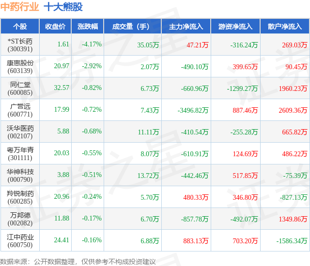 个股表现方面,中药行业当日领跌股为*ST长药(300391),该股当日报收1.61,下跌4.17%,成交量35.05万,主力资金净流入47.21万元。康惠股份(603139)以下跌2.92%紧随其后,该股当日成交量2.07万,主力资金净流出490.1万元。除此之外,同仁堂(600085)、广誉远(600771)、沃华医药(002107)均进入当日熊股之列。具体个股列表见下表: