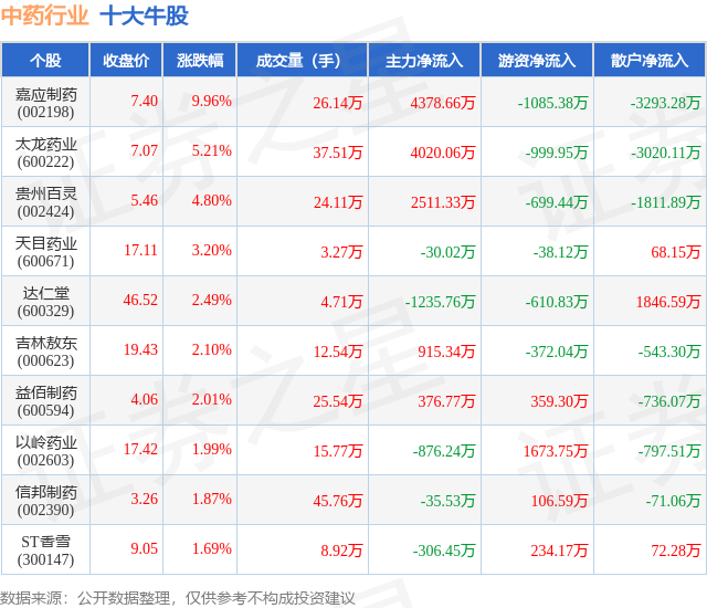 个股表现方面,中药行业当日领涨股为嘉应制药(002198),该股当日报收7.4,上涨9.96%,成交量26.14万,主力资金净流入4378.66万元。太龙药业(600222)以上涨5.21%紧随其后,该股当日成交量37.51万,主力资金净流入4020.06万元。除此之外,贵州百灵(002424)、天目药业(600671)、达仁堂(600329)均进入当日牛股之列。具体个股列表见下表: