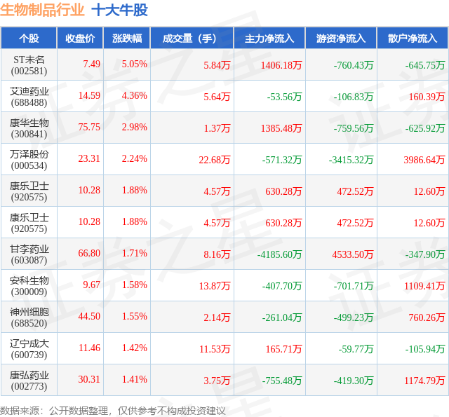 个股表现方面,生物制品行业当日领涨股为ST未名(002581),该股当日报收7.49,上涨5.05%,成交量5.84万,主力资金净流入1406.18万元。艾迪药业(688488)以上涨4.36%紧随其后,该股当日成交量5.64万,主力资金净流出53.56万元。除此之外,康华生物(300841)、万泽股份(000534)、康乐卫士(920575)均进入当日牛股之列。具体个股列表见下表: