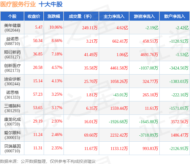 个股表现方面,医疗服务行业当日领涨股为美年健康(002044),该股当日报收5.47,上涨10.06%,成交量249.11万,主力资金净流入4.62亿元。益诺思(688710)以上涨8.66%紧随其后,该股当日成交量3.21万,主力资金净流入662.41万元。除此之外,昭衍新药(603127)、创新医疗(002173)、迪安诊断(300244)均进入当日牛股之列。具体个股列表见下表: