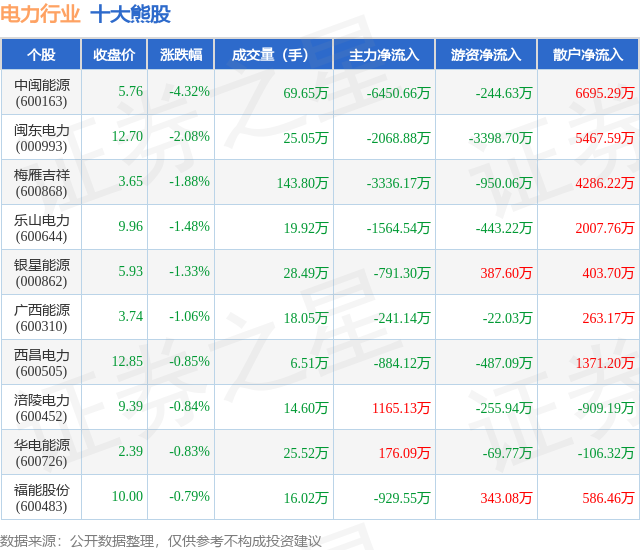 个股表现方面,电力行业当日领跌股为中闽能源(600163),该股当日报收5.76,下跌4.32%,成交量69.65万,主力资金净流出6450.66万元。闽东电力(000993)以下跌2.08%紧随其后,该股当日成交量25.05万,主力资金净流出2068.88万元。除此之外,梅雁吉祥(600868)、乐山电力(600644)、银星能源(000862)均进入当日熊股之列。具体个股列表见下表: