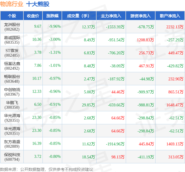 个股表现方面,物流行业当日领跌股为龙洲股份(002682),该股当日报收9.67,下跌9.96%,成交量12.37万,主力资金净流出1553.39万元。嘉诚国际(603535)以下跌3.0%紧随其后,该股当日成交量8.49万,主力资金净流出951.54万元。除此之外,ST雪发(002485)、恒基达鑫(002492)、畅联股份(603648)均进入当日熊股之列。具体个股列表见下表: