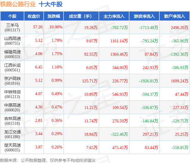 个股表现方面,铁路公路行业当日领涨股为三羊马(001317),该股当日报收57.2,上涨10.0%,成交量19.28万,主力资金净流出782.72万元。山西高速(000755)以上涨1.79%紧随其后,该股当日成交量9.07万,主力资金净流入1161.14万元。除此之外,福建高速(600033)、江西长运(600561)、京沪高铁(601816)均进入当日牛股之列。具体个股列表见下表: