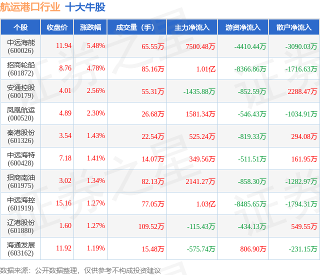 个股表现方面,航运港口行业当日领涨股为中远海能(600026),该股当日报收11.94,上涨5.48%,成交量65.55万,主力资金净流入7500.48万元。招商轮船(601872)以上涨4.78%紧随其后,该股当日成交量85.16万,主力资金净流入1.01亿元。除此之外,安通控股(600179)、凤凰航运(000520)、秦港股份(601326)均进入当日牛股之列。具体个股列表见下表: