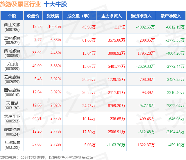 个股表现方面,旅游及景区行业当日领涨股为曲江文旅(600706),该股当日报收12.28,上涨10.04%,成交量45.98万,主力资金净流入1.17亿元。三峡旅游(002627)以上涨6.88%紧随其后,该股当日成交量61.68万,主力资金净流入3575.0万元。除此之外,西域旅游(300859)、长白山(603099)、云南旅游(002059)均进入当日牛股之列。具体个股列表见下表: