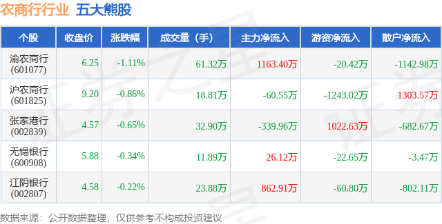个股表现方面,农商行行业当日领跌股为渝农商行(601077),该股当日报收6.25,下跌1.11%,成交量61.32万,主力资金净流入1163.4万元。沪农商行(601825)以下跌0.86%紧随其后,该股当日成交量18.81万,主力资金净流出60.55万元。除此之外,张家港行(002839)、无锡银行(600908)、江阴银行(002807)均进入当日熊股之列。具体个股列表见下表: