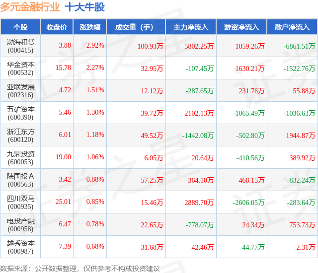 个股表现方面,多元金融行业当日领涨股为渤海租赁(000415),该股当日报收3.88,上涨2.92%,成交量100.93万,主力资金净流入5802.25万元。华金资本(000532)以上涨2.27%紧随其后,该股当日成交量32.95万,主力资金净流出107.45万元。除此之外,亚联发展(002316)、五矿资本(600390)、浙江东方(600120)均进入当日牛股之列。具体个股列表见下表: