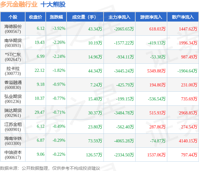 个股表现方面,多元金融行业当日领跌股为海德股份(000567),该股当日报收6.12,下跌3.92%,成交量43.34万,主力资金净流出2065.65万元。南华期货(603093)以下跌2.26%紧随其后,该股当日成交量10.19万,主力资金净流出1577.22万元。除此之外,*ST仁东(002647)、拉卡拉(300773)、香溢融通(600830)均进入当日熊股之列。具体个股列表见下表: