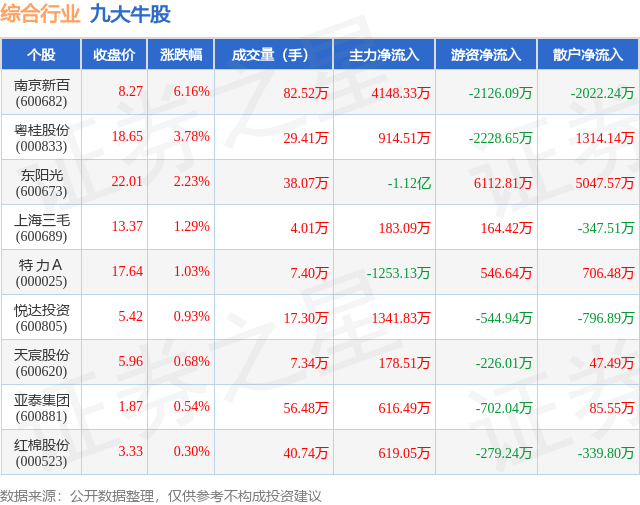 个股表现方面,综合行业当日领涨股为南京新百(600682),该股当日报收8.27,上涨6.16%,成交量82.52万,主力资金净流入4148.33万元。粤桂股份(000833)以上涨3.78%紧随其后,该股当日成交量29.41万,主力资金净流入914.51万元。除此之外,东阳光(600673)、上海三毛(600689)、特 力A(000025)均进入当日牛股之列。具体个股列表见下表: