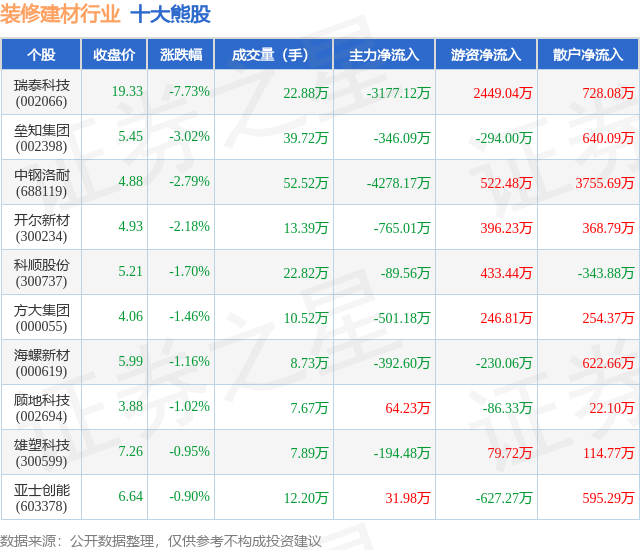 个股表现方面,装修建材行业当日领跌股为瑞泰科技(002066),该股当日报收19.33,下跌7.73%,成交量22.88万,主力资金净流出3177.12万元。垒知集团(002398)以下跌3.02%紧随其后,该股当日成交量39.72万,主力资金净流出346.09万元。除此之外,中钢洛耐(688119)、开尔新材(300234)、科顺股份(300737)均进入当日熊股之列。具体个股列表见下表: