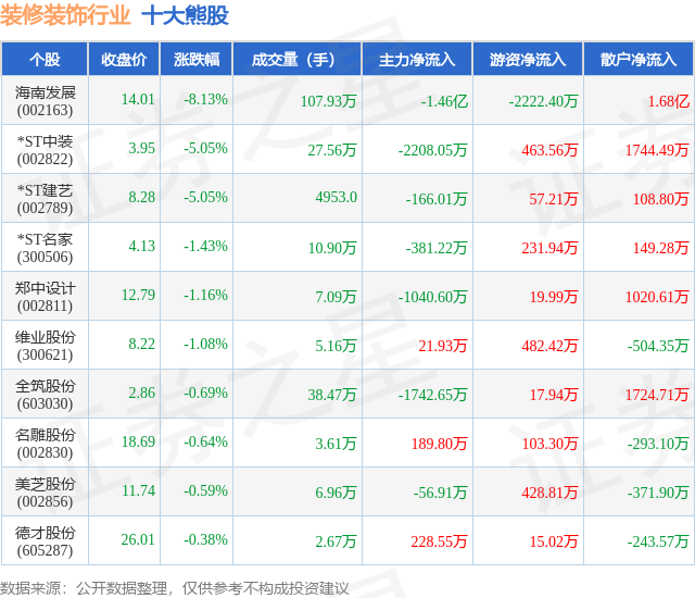 个股表现方面,装修装饰行业当日领跌股为海南发展(002163),该股当日报收14.01,下跌8.13%,成交量107.93万,主力资金净流出1.46亿元。*ST中装(002822)以下跌5.05%紧随其后,该股当日成交量27.56万,主力资金净流出2208.05万元。除此之外,*ST建艺(002789)、*ST名家(300506)、郑中设计(002811)均进入当日熊股之列。具体个股列表见下表: