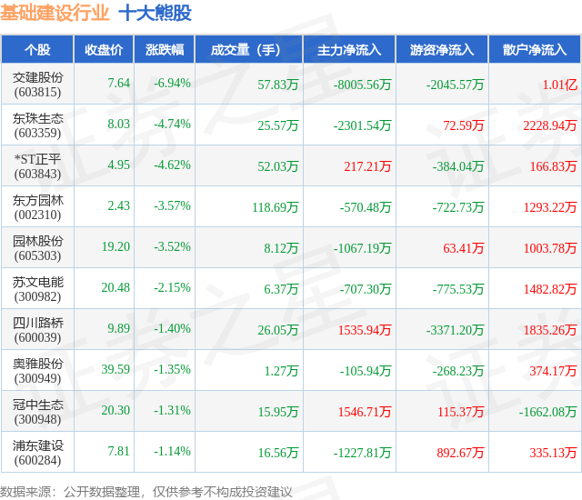 个股表现方面,基础建设行业当日领跌股为交建股份(603815),该股当日报收7.64,下跌6.94%,成交量57.83万,主力资金净流出8005.56万元。东珠生态(603359)以下跌4.74%紧随其后,该股当日成交量25.57万,主力资金净流出2301.54万元。除此之外,*ST正平(603843)、东方园林(002310)、园林股份(605303)均进入当日熊股之列。具体个股列表见下表: