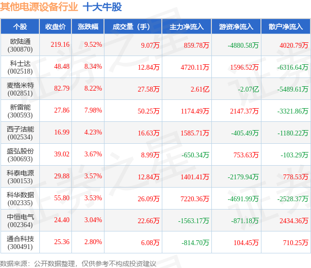 个股表现方面,其他电源设备行业当日领涨股为欧陆通(300870),该股当日报收219.16,上涨9.52%,成交量9.07万,主力资金净流入859.78万元。科士达(002518)以上涨8.34%紧随其后,该股当日成交量12.84万,主力资金净流入4720.11万元。除此之外,麦格米特(002851)、新雷能(300593)、西子洁能(002534)均进入当日牛股之列。具体个股列表见下表: