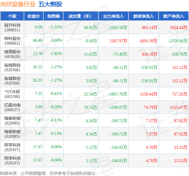 个股表现方面,光伏设备行业当日领跌股为琏升科技(300051),该股当日报收6.68,下跌5.52%,成交量38.91万,主力资金净流出1926.58万元。帝科股份(300842)以下跌3.68%紧随其后,该股当日成交量8.69万,主力资金净流入1267.97万元。除此之外,清源股份(603628)、连城数控(920368)、连城数控(920368)均进入当日熊股之列。具体个股列表见下表: