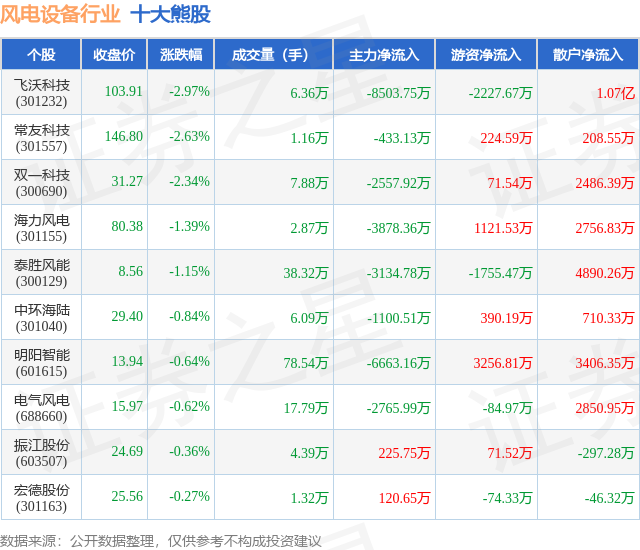 个股表现方面,风电设备行业当日领跌股为飞沃科技(301232),该股当日报收103.91,下跌2.97%,成交量6.36万,主力资金净流出8503.75万元。常友科技(301557)以下跌2.63%紧随其后,该股当日成交量1.16万,主力资金净流出433.13万元。除此之外,双一科技(300690)、海力风电(301155)、泰胜风能(300129)均进入当日熊股之列。具体个股列表见下表: