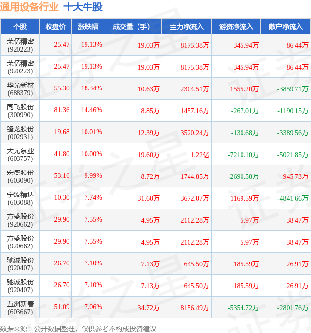 个股表现方面,通用设备行业当日领涨股为荣亿精密(920223),该股当日报收25.47,上涨19.13%,成交量19.03万,主力资金净流入8175.38万元。荣亿精密(920223)以上涨19.13%紧随其后,该股当日成交量19.03万,主力资金净流入8175.38万元。除此之外,华光新材(688379)、同飞股份(300990)、锋龙股份(002931)均进入当日牛股之列。具体个股列表见下表: