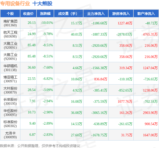 个股表现方面,专用设备行业当日领跌股为南矿集团(001360),该股当日报收20.13,下跌10.01%,成交量15.17万,主力资金净流出1186.68万元。航天工程(603698)以下跌9.78%紧随其后,该股当日成交量40.01万,主力资金净流出1887.33万元。除此之外,大鹏工业(920091)、大鹏工业(920091)、华研精机(301138)均进入当日熊股之列。具体个股列表见下表: