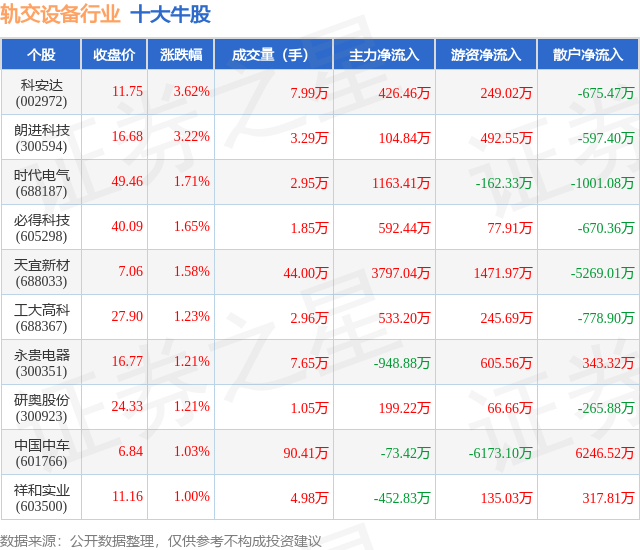 个股表现方面,轨交设备行业当日领涨股为科安达(002972),该股当日报收11.75,上涨3.62%,成交量7.99万,主力资金净流入426.46万元。朗进科技(300594)以上涨3.22%紧随其后,该股当日成交量3.29万,主力资金净流入104.84万元。除此之外,时代电气(688187)、必得科技(605298)、天宜新材(688033)均进入当日牛股之列。具体个股列表见下表: