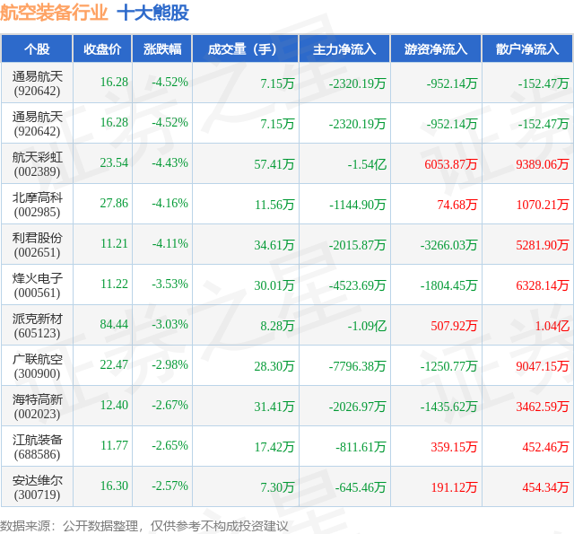 个股表现方面,航空装备行业当日领跌股为通易航天(920642),该股当日报收16.28,下跌4.52%,成交量7.15万,主力资金净流出2320.19万元。通易航天(920642)以下跌4.52%紧随其后,该股当日成交量7.15万,主力资金净流出2320.19万元。除此之外,航天彩虹(002389)、北摩高科(002985)、利君股份(002651)均进入当日熊股之列。具体个股列表见下表: