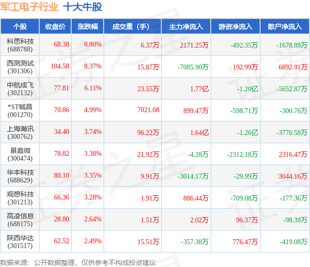 个股表现方面,军工电子行业当日领涨股为科思科技(688788),该股当日报收68.38,上涨8.8%,成交量6.37万,主力资金净流入2171.25万元。西测测试(301306)以上涨8.37%紧随其后,该股当日成交量15.87万,主力资金净流出7085.9万元。除此之外,中航成飞(302132)、*ST铖昌(001270)、上海瀚讯(300762)均进入当日牛股之列。具体个股列表见下表: