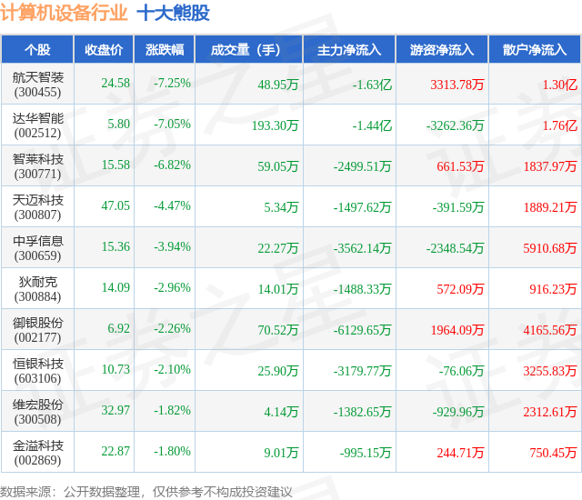 个股表现方面,计算机设备行业当日领跌股为航天智装(300455),该股当日报收24.58,下跌7.25%,成交量48.95万,主力资金净流出1.63亿元。达华智能(002512)以下跌7.05%紧随其后,该股当日成交量193.3万,主力资金净流出1.44亿元。除此之外,智莱科技(300771)、天迈科技(300807)、中孚信息(300659)均进入当日熊股之列。具体个股列表见下表: