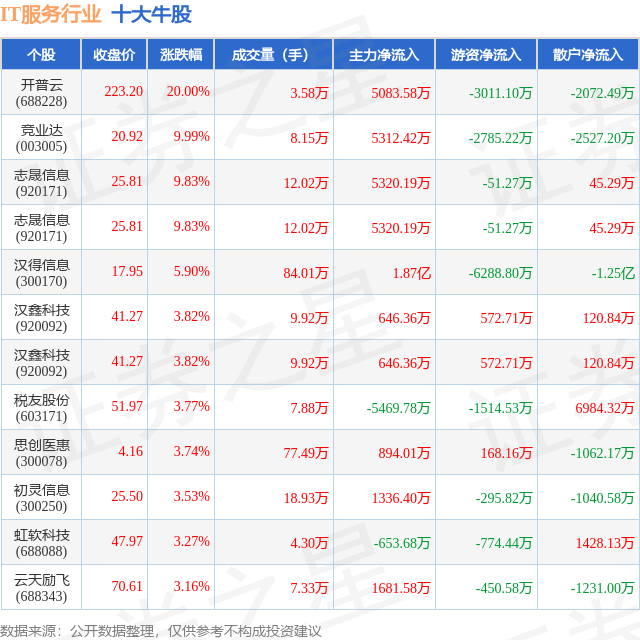 个股表现方面,IT服务行业当日领涨股为开普云(688228),该股当日报收223.2,上涨20.0%,成交量3.58万,主力资金净流入5083.58万元。竞业达(003005)以上涨9.99%紧随其后,该股当日成交量8.15万,主力资金净流入5312.42万元。除此之外,志晟信息(920171)、志晟信息(920171)、汉得信息(300170)均进入当日牛股之列。具体个股列表见下表: