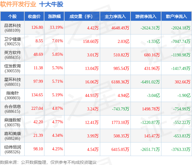 个股表现方面,软件开发行业当日领涨股为品茗科技(688109),该股当日报收126.8,上涨13.19%,成交量4.42万,主力资金净流入4648.49万元。卫宁健康(300253)以上涨7.01%紧随其后,该股当日成交量158.6万,主力资金净流入2.03亿元。除此之外,英方软件(688435)、佳发教育(300559)、星环科技(688031)均进入当日牛股之列。具体个股列表见下表:
