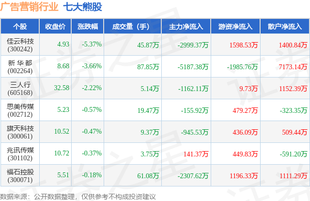 个股表现方面,广告营销行业当日领跌股为佳云科技(300242),该股当日报收4.93,下跌5.37%,成交量45.87万,主力资金净流出2999.37万元。新 华 都(002264)以下跌3.66%紧随其后,该股当日成交量87.85万,主力资金净流出5187.38万元。除此之外,三人行(605168)、思美传媒(002712)、旗天科技(300061)均进入当日熊股之列。具体个股列表见下表: