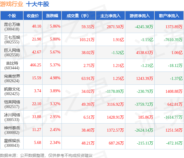 个股表现方面,游戏行业当日领涨股为昆仑万维(300418),该股当日报收40.1,上涨5.86%,成交量59.33万,主力资金净流入2871.5万元。三七互娱(002555)以上涨5.8%紧随其后,该股当日成交量103.21万,主力资金净流入1.91亿元。除此之外,巨人网络(002558)、吉比特(603444)、完美世界(002624)均进入当日牛股之列。具体个股列表见下表: