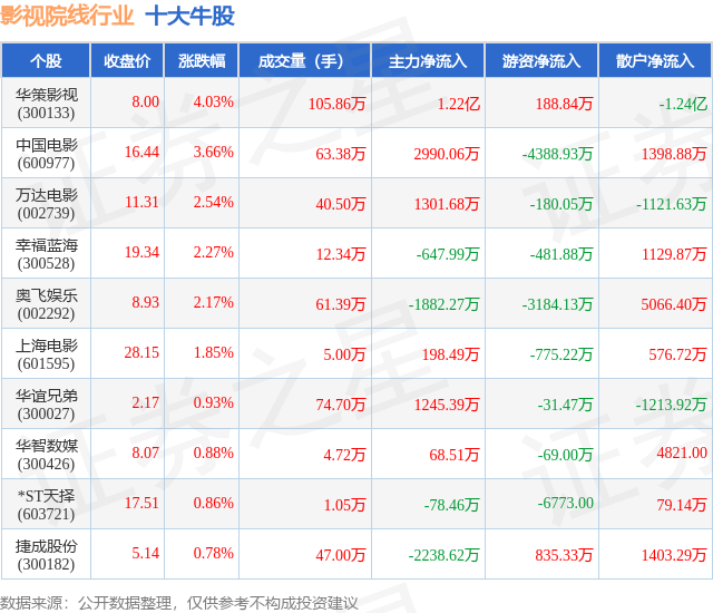 个股表现方面,影视院线行业当日领涨股为华策影视(300133),该股当日报收8.0,上涨4.03%,成交量105.86万,主力资金净流入1.22亿元。中国电影(600977)以上涨3.66%紧随其后,该股当日成交量63.38万,主力资金净流入2990.06万元。除此之外,万达电影(002739)、幸福蓝海(300528)、奥飞娱乐(002292)均进入当日牛股之列。具体个股列表见下表: