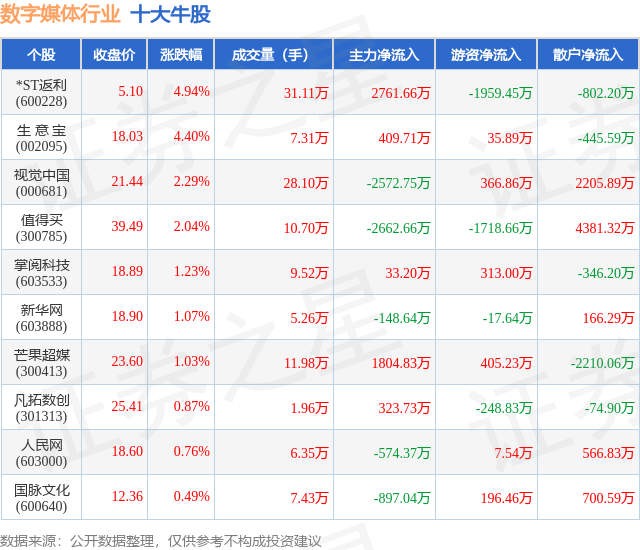 个股表现方面,数字媒体行业当日领涨股为*ST返利(600228),该股当日报收5.1,上涨4.94%,成交量31.11万,主力资金净流入2761.66万元。生 意 宝(002095)以上涨4.4%紧随其后,该股当日成交量7.31万,主力资金净流入409.71万元。除此之外,视觉中国(000681)、值得买(300785)、掌阅科技(603533)均进入当日牛股之列。具体个股列表见下表: